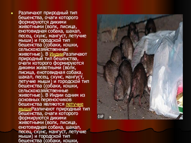 енотовидная собака, шакал, песец, скунс, мангуст, летучие мыши) и городской тип бешенства (собаки, кошки, сельскохозяйственные животные). В ИндииРазличают природный тип бешенства, очаги которого формируются дикими животными (волк, лисица, енотовидная собака, шакал, песец, скунс, мангуст, летучие мыши) и городской тип бешенства (собаки, кошки, сельскохозяйственные животные). В Индии одним из основных переносчиков бешенства являются летучие мышиРазличают природный тип бешенства, очаги которого формируются дикими животными (волк, лисица, енотовидная собака, шакал, песец, скунс, мангуст, летучие мыши) и городской тип бешенства (собаки, кошки, сельскохозяйственные животные). В Индии одним из основных переносчиков бешенства являются летучие мыши (3/4 случаев заражения людей от общей статистики заболеваемости бешенством). Случаи заболевания мелких грызунов бешенством и передачи вируса от них человеку практически неизвестны. Существует, однако, гипотеза, что естественным резервуаром вируса являются грызуны, которые способны длительно носить инфекцию, не погибая в течение нескольких дней после заражения.
