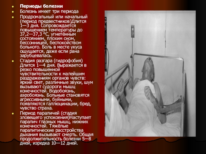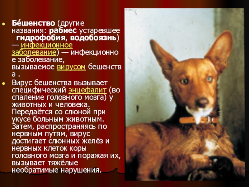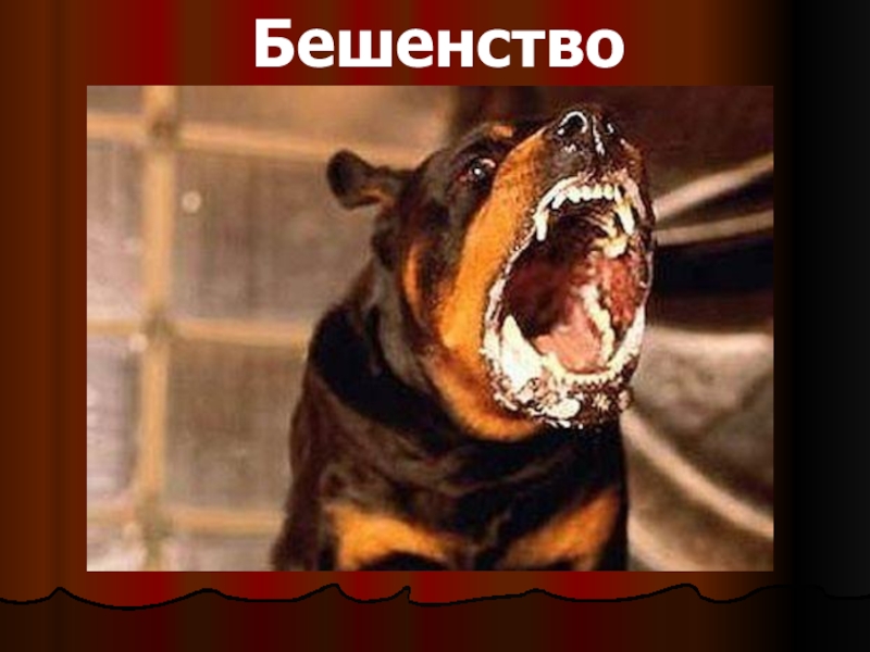 Слайд 22Бе́шенство (другие названия: рабиес устаревшее гидрофобия, водобоязнь) — инфекционное заболевание) — инфекционное заболевание, вызываемое вирусом бешенства .