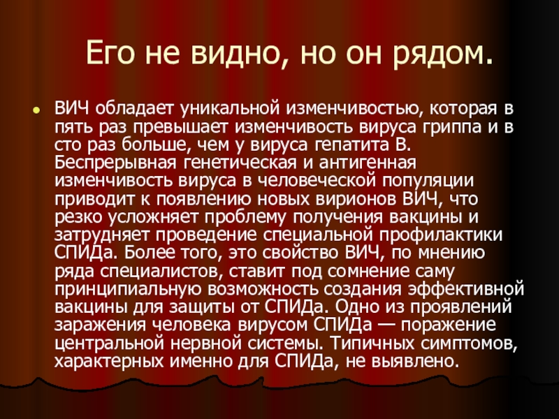в пять раз превышает изменчивость вируса гриппа и в сто раз больше, чем у вируса гепатита В. Беспрерывная генетическая и антигенная изменчивость вируса в человеческой популяции приводит к появлению новых вирионов ВИЧ, что резко усложняет проблему получения вакцины и затрудняет проведение специальной профилактики СПИДа. Более того, это свойство ВИЧ, по мнению ряда специалистов, ставит под сомнение саму принципиальную возможность создания эффективной вакцины для защиты от СПИДа. Одно из проявлений заражения человека вирусом СПИДа — поражение центральной нервной системы. Типичных симптомов, характерных именно для СПИДа, не выявлено.