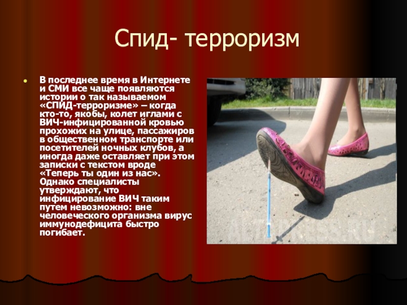 истории о так называемом «СПИД-терроризме» – когда кто-то, якобы, колет иглами с ВИЧ-инфицированной кровью прохожих на улице, пассажиров в общественном транспорте или посетителей ночных клубов, а иногда даже оставляет при этом записки с текстом вроде «Теперь ты один из нас». Однако специалисты утверждают, что инфицирование ВИЧ таким путем невозможно: вне человеческого организма вирус иммунодефицита быстро погибает.
