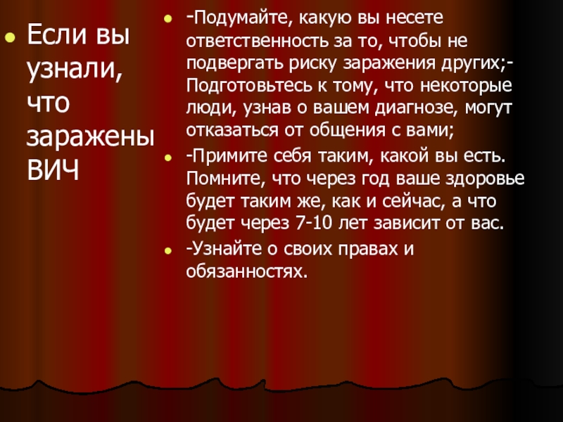 за то, чтобы не подвергать риску заражения других;-Подготовьтесь к тому, что некоторые люди, узнав о вашем диагнозе, могут отказаться от общения с вами;