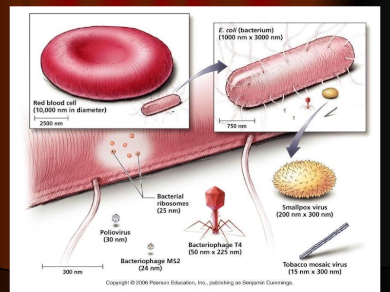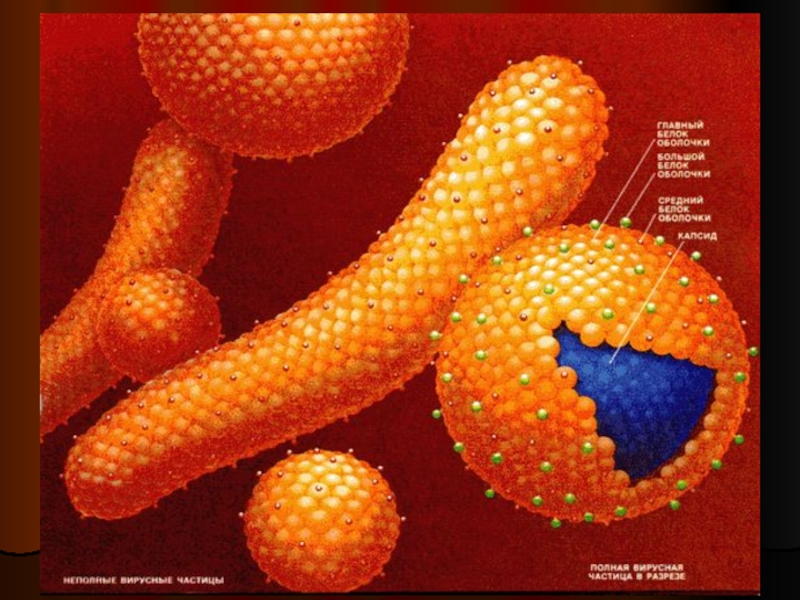 Средний вирус примерно в 50 раз меньше бактерии. Вирусы находятся как- бы на самой границе живого и неживого.