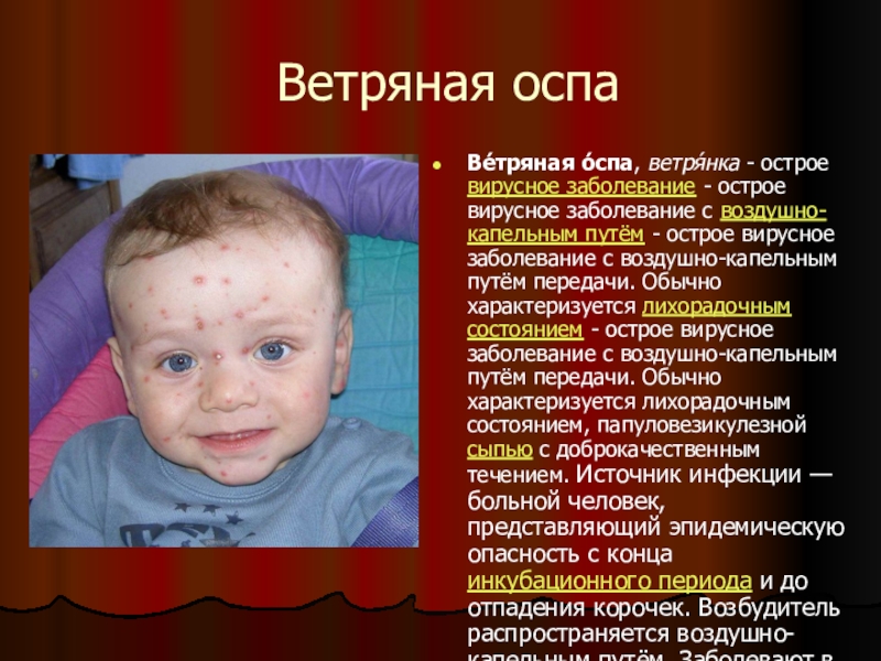 заболевание с воздушно-капельным путём - острое вирусное заболевание с воздушно-капельным путём передачи. Обычно характеризуется лихорадочным состоянием - острое вирусное заболевание с воздушно-капельным путём передачи. Обычно характеризуется лихорадочным состоянием, папуловезикулезной сыпью с доброкачественным течением. Источник инфекции — больной человек, представляющий эпидемическую опасность с конца инкубационного периода и до отпадения корочек. Возбудитель распространяется воздушно-капельным путём. Заболевают в основном дети в возрасте от 6 месяцев до 7 лет. Взрослые болеют ветряной оспой редко, поскольку обычно переносят её ещё в детском возрасте.