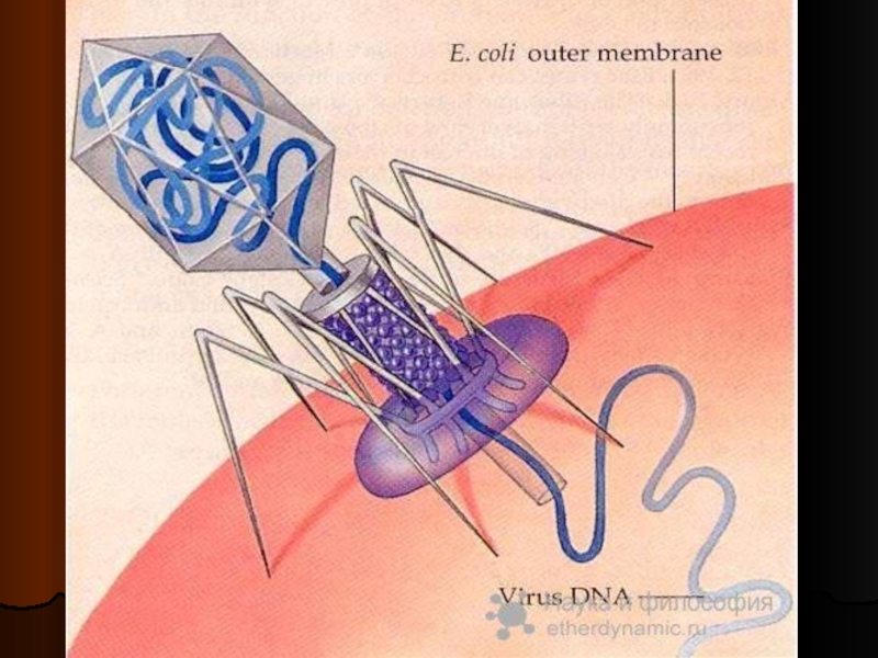 или фаги, которые способны проникать в бактериальную клетку и разрушать ее. Тело фага кишечной палочки состоит из головки, от которой отходит полый стержень, окруженный чехлом из сократительного белка. Стержень заканчивается базальной пластинкой, на которой закреплены шесть нитей. Внутри головки находится ДНК. Бактериофаг при помощи отростков прикрепляется к поверхности кишечной палочки и в месте соприкосновения с ней растворяет с помощью фермента клеточную стенку. После этого за счет сокращения головки молекула ДНК фага впрыскивается через канал стержня в клетку. Примерно через 10—15 мин под действием этой ДНК перестраивается весь метаболизм бактериальной клетки, и она начинает синтезировать ДНК бактериофага, а не собственную. При этом синтезируется и фаговый белок. Завершается процесс появлением 200— 1 000 новых фаговых частиц, в результате чего клетка бактерии погибает.