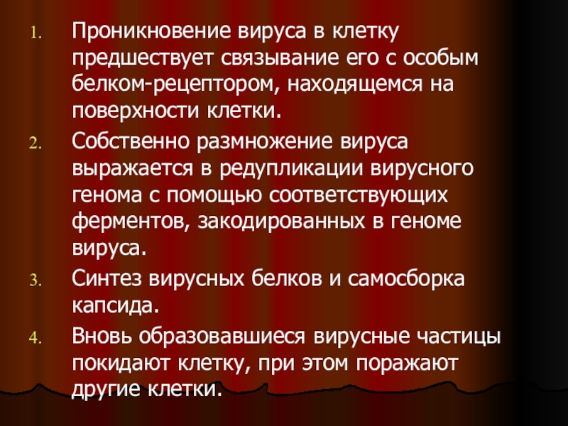 Собственно размножение вируса выражается в редупликации вирусного генома с помощью соответствующих ферментов, закодированных в геноме вируса.