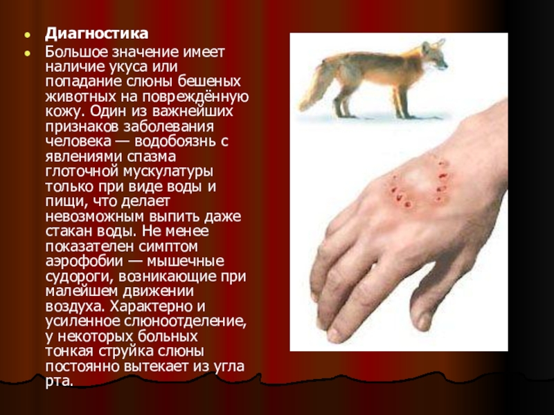 Большое значение имеет наличие укуса или попадание слюны бешеных животных на