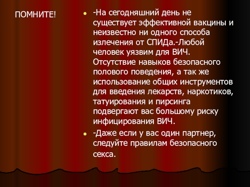 одного способа излечения от СПИДа.-Любой человек уязвим для ВИЧ. Отсутствие навыков безопасного полового поведения, а так же использование общих инструментов для введения лекарств, наркотиков, татуирования и пирсинга подвергают вас большому риску инфицирования ВИЧ.
