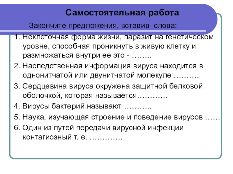 Самостоятельная работа    Закончите предложения, вставив слова:1. Неклеточная форма жизни, паразит на генетическом уровне, способная