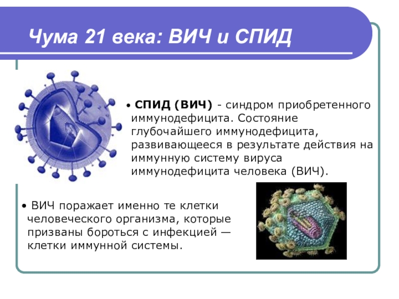 Чума 21 века: ВИЧ и СПИД СПИД (ВИЧ) - синдром приобретенного иммунодефицита. Состояние глубочайшего иммунодефицита, развивающееся в