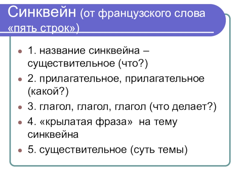 Синквейн (от французского слова «пять строк»)1. название синквейна – существительное (что?)2. прилагательное, прилагательное (какой?)3. глагол, глагол, глагол