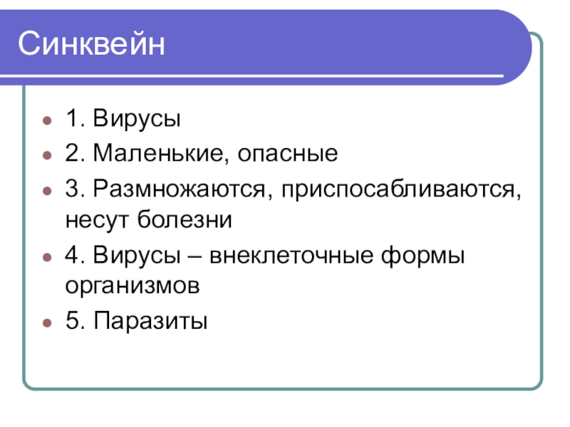 Синквейн 1. Вирусы2. Маленькие, опасные3. Размножаются, приспосабливаются, несут болезни 4. Вирусы – внеклеточные формы организмов 5. Паразиты