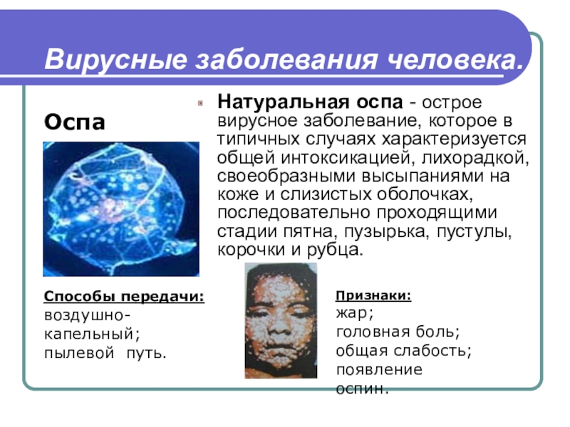 Вирусные заболевания человека. Натуральная оспа - острое вирусное заболевание, которое в типичных случаях характеризуется общей интоксикацией, лихорадкой,