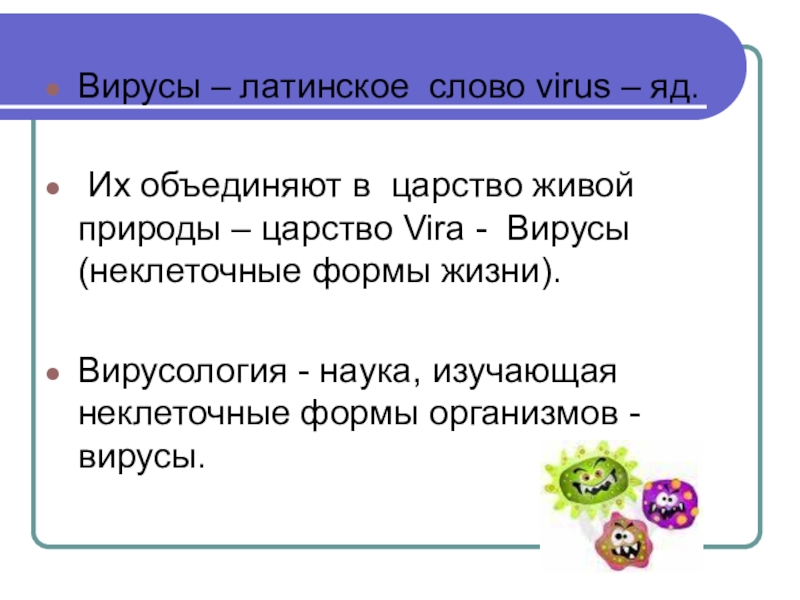 Вирусы – латинское слово virus – яд. Их объединяют в царство живой природы – царство Vira -