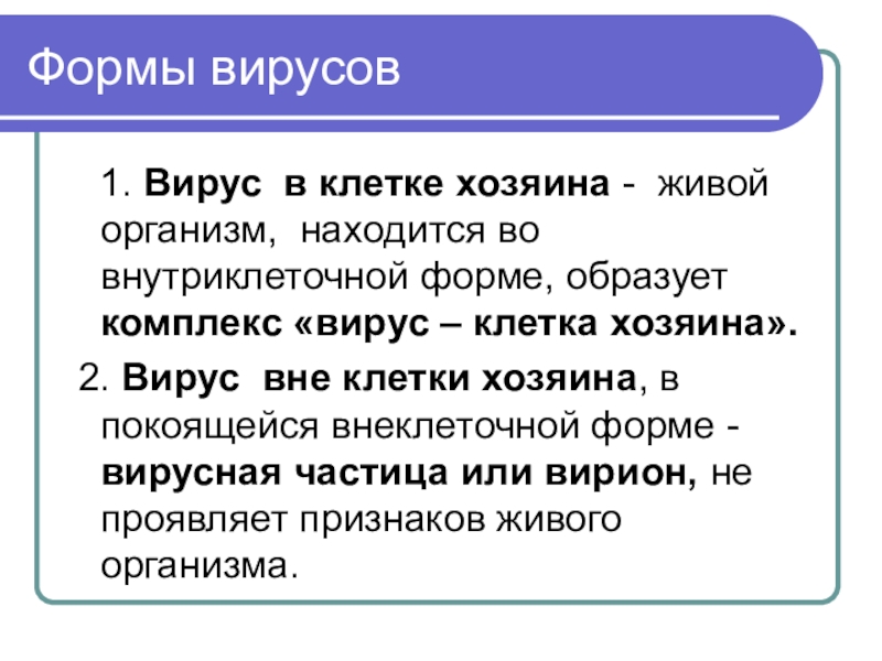 Формы вирусов  1. Вирус в клетке хозяина - живой организм, находится во внутриклеточной форме, образует комплекс