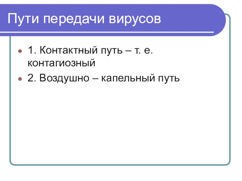 Пути передачи вирусов1. Контактный путь – т. е. контагиозный2. Воздушно – капельный путь
