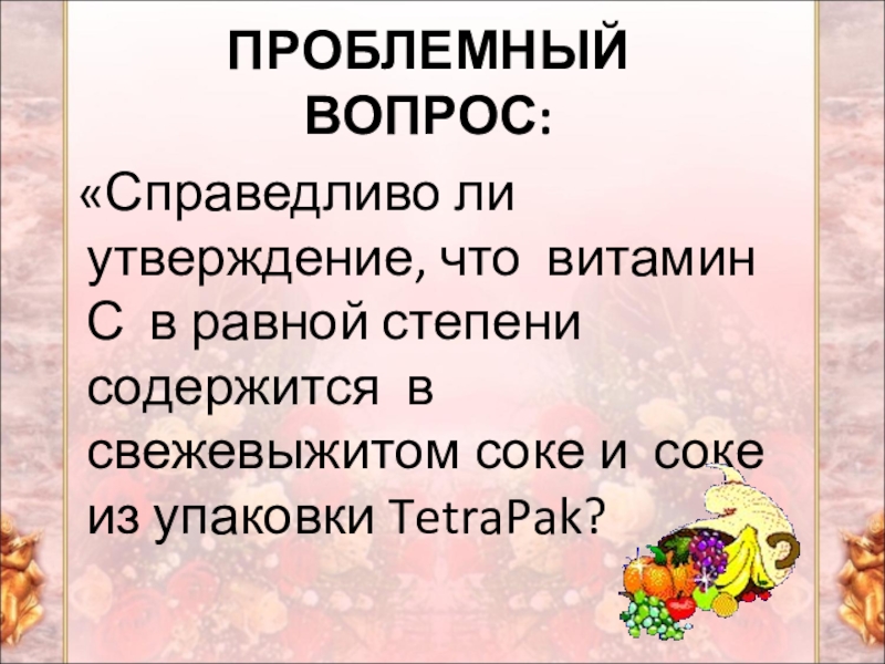 ПРОБЛЕМНЫЙ ВОПРОС: «Справедливо ли утверждение, что витамин С в равной степени содержится в свежевыжитом соке и соке
