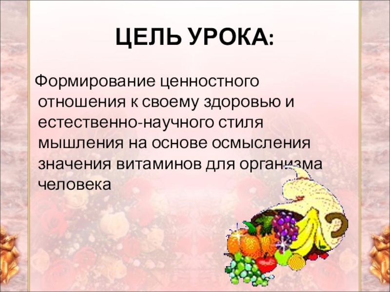 ЦЕЛЬ УРОКА: Формирование ценностного отношения к своему здоровью и естественно-научного стиля мышления на основе осмысления значения витаминов для организма человека