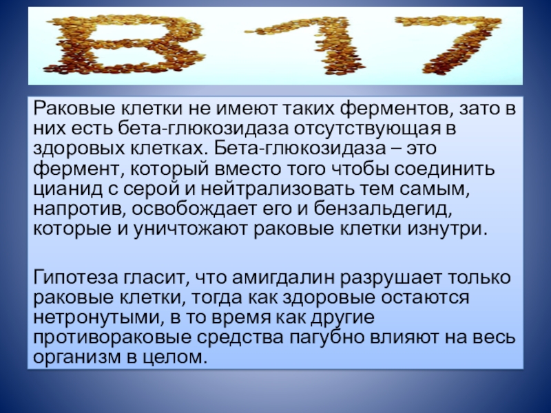 отсутствующая в здоровых клетках. Бета-глюкозидаза – это фермент, который вместо того чтобы соединить цианид с серой и нейтрализовать тем самым, напротив, освобождает его и бензальдегид, которые и уничтожают раковые клетки изнутри.