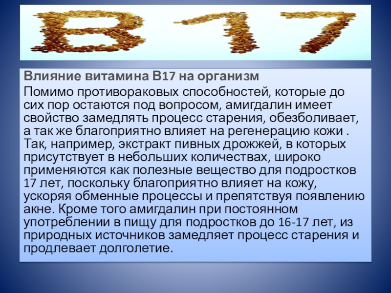 остаются под вопросом, амигдалин имеет свойство замедлять процесс старения, обезболивает, а так же благоприятно влияет на регенерацию кожи .Так, например, экстракт пивных дрожжей, в которых присутствует в небольших количествах, широко применяются как полезные вещество для подростков 17 лет, поскольку благоприятно влияет на кожу, ускоряя обменные процессы и препятствуя появлению акне. Кроме того амигдалин при постоянном употреблении в пищу для подростков до 16-17 лет, из природных источников замедляет процесс старения и продлевает долголетие.