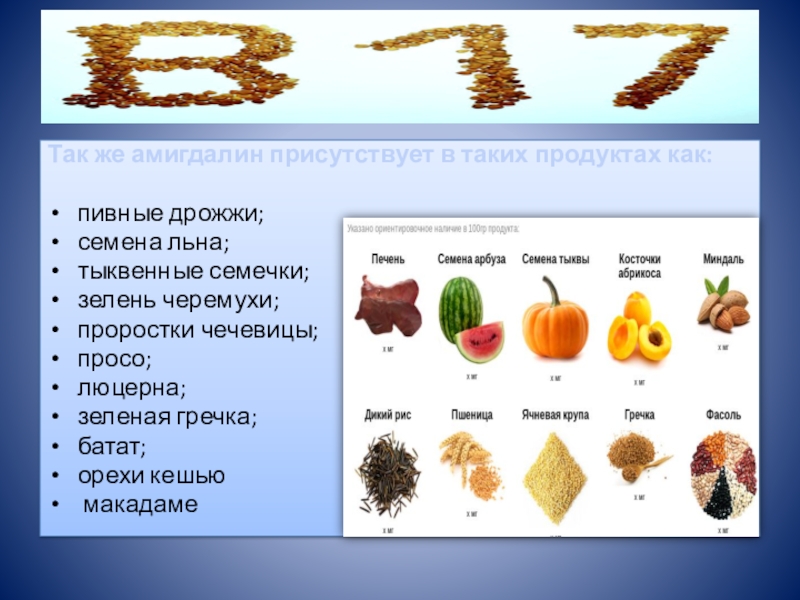 Слайд 4Так же амигдалин присутствует в таких продуктах как: