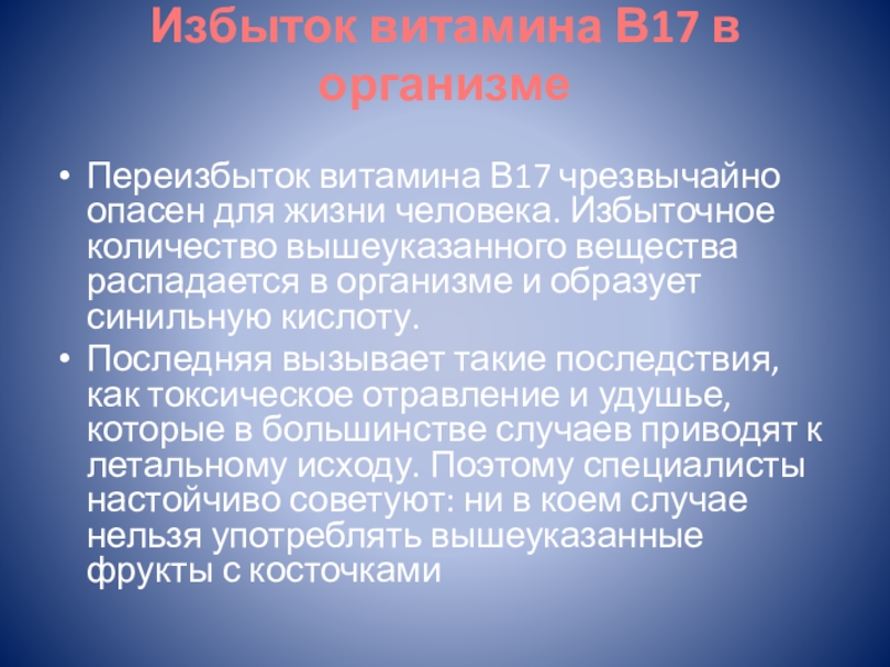 жизни человека. Избыточное количество вышеуказанного вещества распадается в организме и образует синильную кислоту.