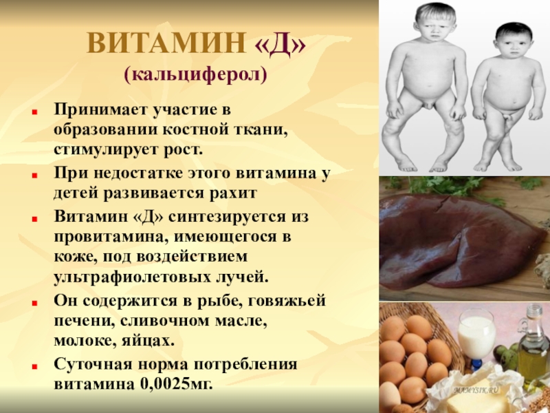 Витамин «Д» синтезируется из провитамина, имеющегося в коже, под воздействием ультрафиолетовых лучей.