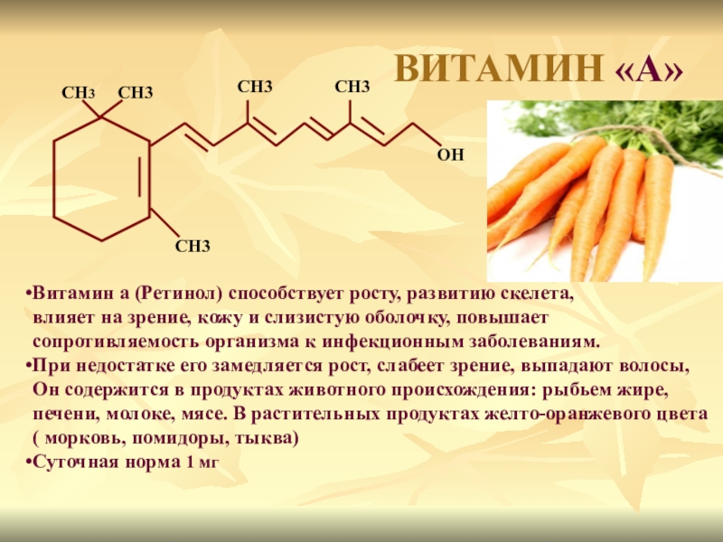 Витамин а (Ретинол) способствует росту, развитию скелета,