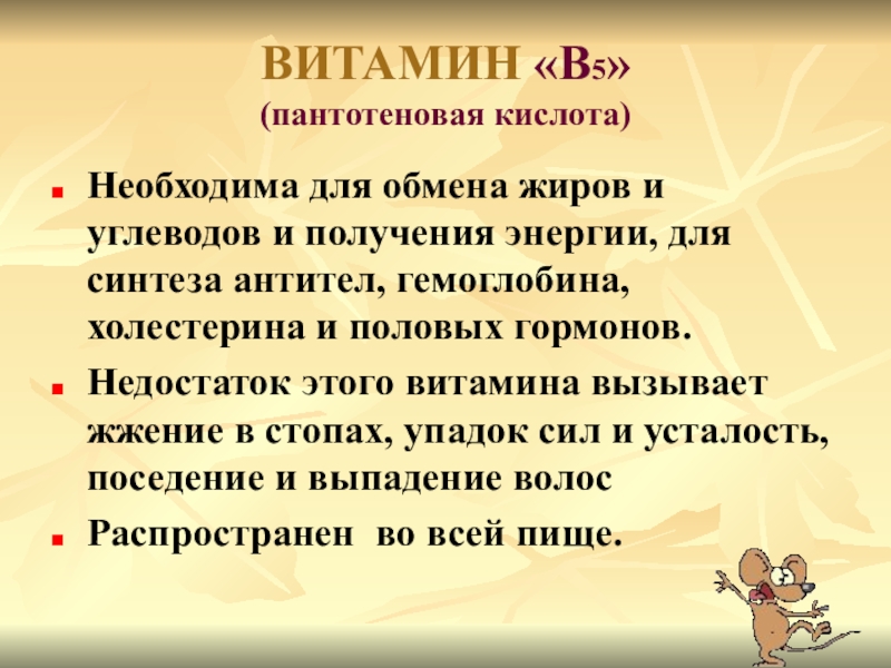 Недостаток этого витамина вызывает жжение в стопах, упадок сил и усталость, поседение и выпадение волос