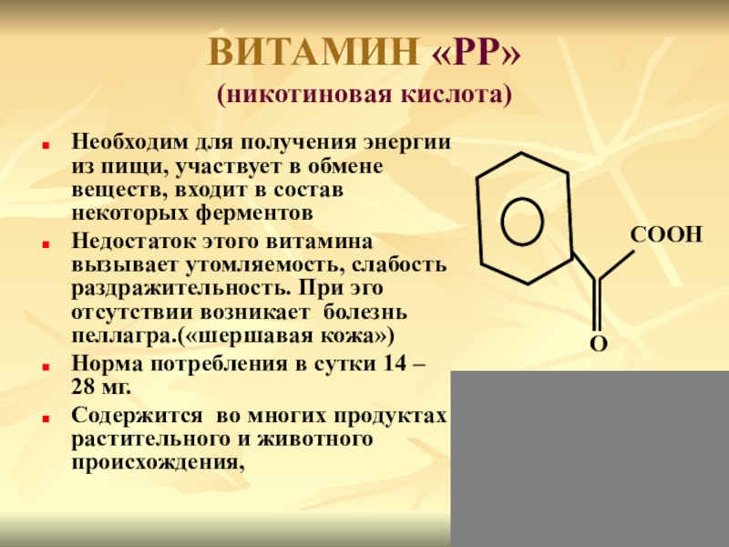 Недостаток этого витамина вызывает утомляемость, слабость раздражительность. При эго отсутствии возникает болезнь пеллагра.(«шершавая кожа»)