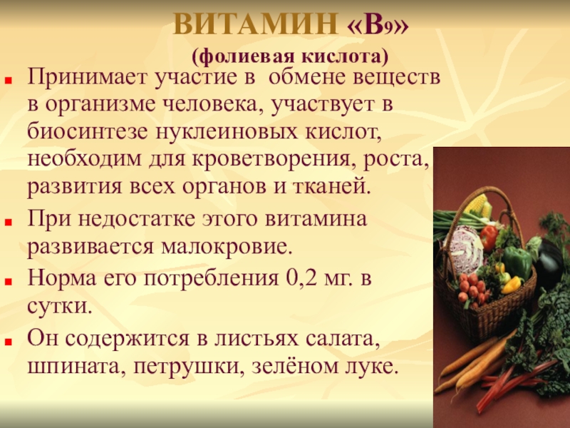 в биосинтезе нуклеиновых кислот, необходим для кроветворения, роста, развития всех органов и тканей.