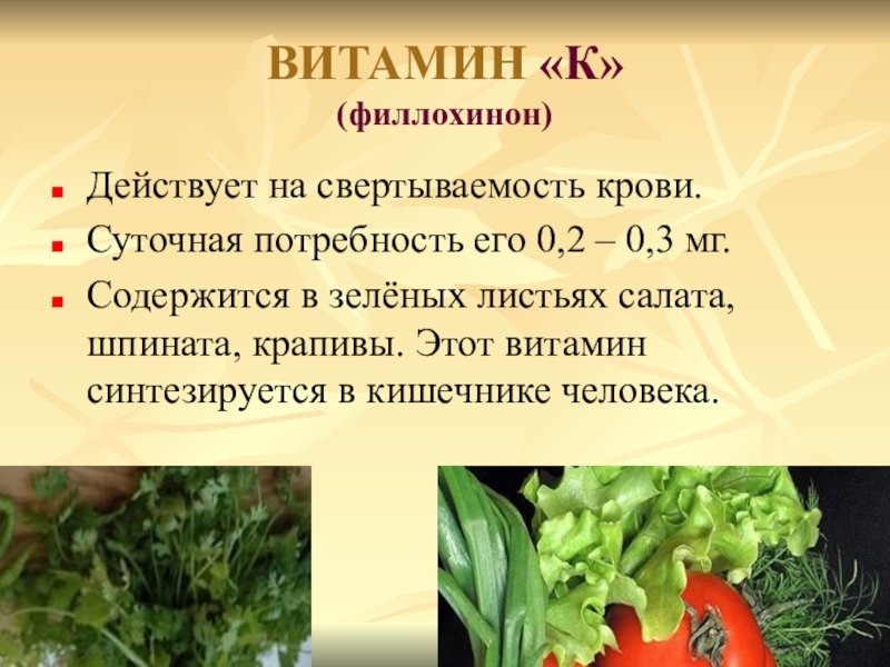 Содержится в зелёных листьях салата, шпината, крапивы. Этот витамин синтезируется в кишечнике человека.