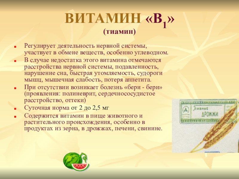 При отсутствии возникает болезнь «бери - бери» (проявления: полиневрит, сердечнососудистое расстройство, оттеки)