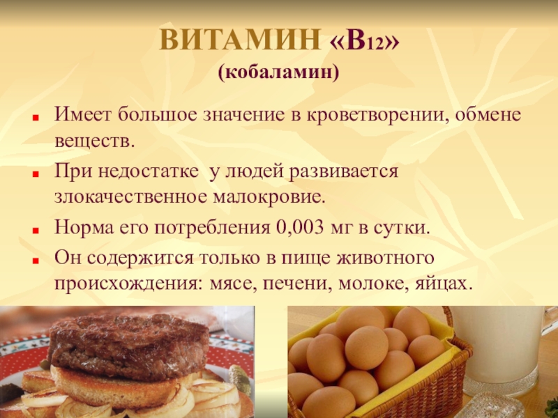 Он содержится только в пище животного происхождения: мясе, печени, молоке, яйцах.