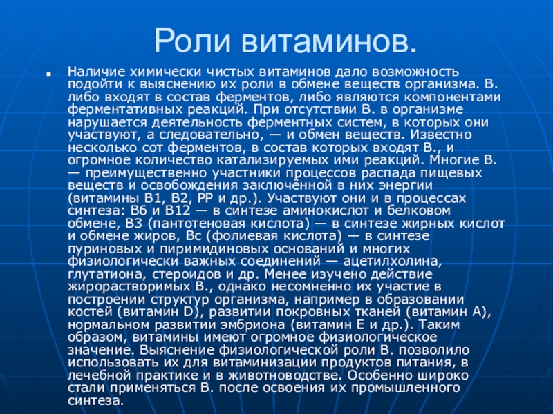 роли в обмене веществ организма. В. либо входят в состав ферментов, либо являются компонентами ферментативных реакций. При отсутствии В. в организме нарушается деятельность ферментных систем, в которых они участвуют, а следовательно, — и обмен веществ. Известно несколько сот ферментов, в состав которых входят В., и огромное количество катализируемых ими реакций. Многие В. — преимущественно участники процессов распада пищевых веществ и освобождения заключённой в них энергии (витамины B1, В2, PP и др.). Участвуют они и в процессах синтеза: B6 и В12 — в синтезе аминокислот и белковом обмене, В3 (пантотеновая кислота) — в синтезе жирных кислот и обмене жиров, Вс (фолиевая кислота) — в синтезе пуриновых и пиримидиновых оснований и многих физиологически важных соединений — ацетилхолина, глутатиона, стероидов и др. Менее изучено действие жирорастворимых В., однако несомненно их участие в построении структур организма, например в образовании костей (витамин D), развитии покровных тканей (витамин А), нормальном развитии эмбриона (витамин Е и др.). Таким образом, витамины имеют огромное физиологическое значение. Выяснение физиологической роли В. позволило использовать их для витаминизации продуктов питания, в лечебной практике и в животноводстве. Особенно широко стали применяться В. после освоения их промышленного синтеза.
