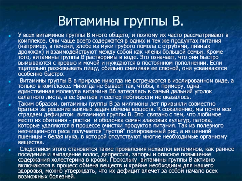 их часто рассматривают в комплексе. Они чаще всего содержатся в одних и тех же продуктах питания (например, в печени, хлебе из муки грубого помола с отрубями, пивных дрожжах) и взаимодействуют между собой как члены большой семьи. Кроме того, витамины группы В растворимы в воде. Это означает, что они быстро вымываются с кровью и мочой и нуждаются в постоянном пополнении. Если тщательно разжевывать пищу, обильно смачивая ее слюной, они усваиваются особенно быстро.