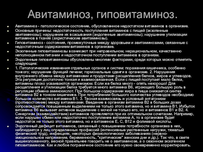 1. Патологические изменения отдельных органов и систем: поражения кишечника, особенно тонкого; нарушение функций печени; гормональные сдвиги в организме. 2. Нарушения внутреннего обмена между витаминами и продуктами расщепления белков, жиров и углеводов. Эта регуляция достаточно тонкая и взаимосвязанная. Если с пищей поступает мало белка, витамины плохо усваиваются организмом. Если же белка много - опять нехорошо! Для расщепления и утилизации белка требуется много витамина В6, играющего большую роль в регуляции обмена аминокислот. При большом содержании жира в пище снижается синтез витамина В2 в тонком кишечнике. При потреблении большого количества углеводов необходимо большое количество витамина В1. 3. Тесная взаимосвязь и условный антагонизм (противостояние) между витаминами. Введение в организм витамина В2 в больших дозах сопровождается повышенным выделением не только этого витамина, но и витамина В1. Избыток витамина В6 вызывает активное выделение с мочой не только его, но и витаминов В1 и В2. 4. Синергизм (взаимодействие) витаминов проявляется при их оптимальном сочетании. Например, если нарушен обмен или недостаточно поступление витамина А, то в организме будет недостаток не только этого витамина, но и витаминов Е, С, В12 и фолиевой кислоты.