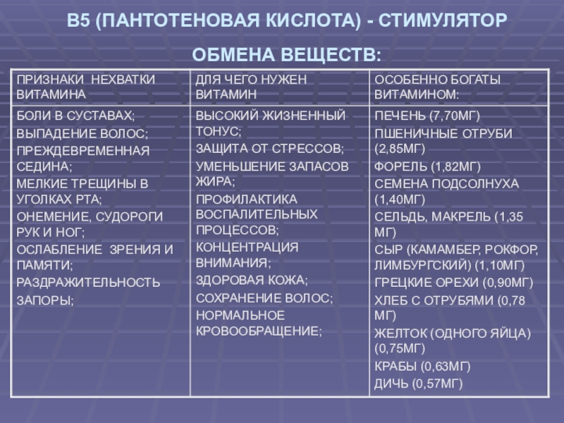 Слайд 12В5 (ПАНТОТЕНОВАЯ КИСЛОТА) - СТИМУЛЯТОР ОБМЕНА ВЕЩЕСТВ: