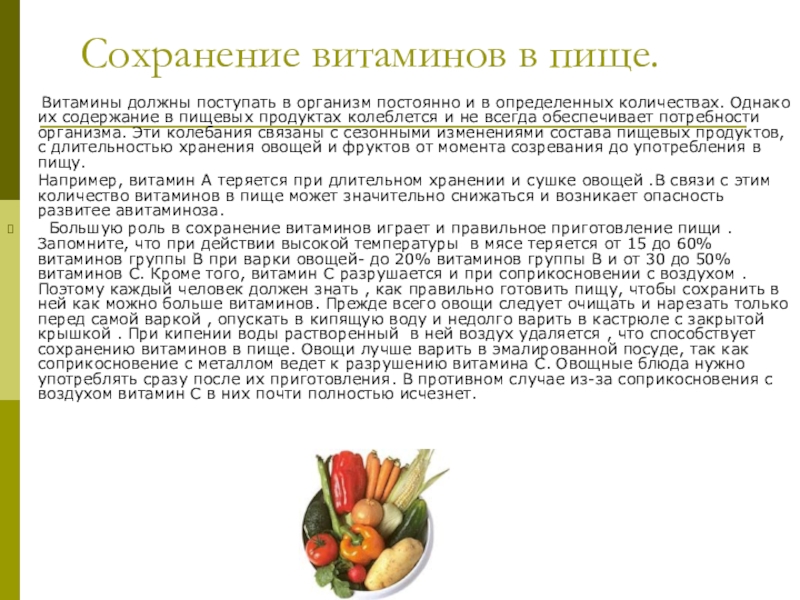 Большую роль в сохранение витаминов играет и правильное приготовление пищи . Запомните, что при действии высокой температуры в мясе теряется от 15 до 60% витаминов группы В при варки овощей- до 20% витаминов группы В и от 30 до 50% витаминов С. Кроме того, витамин С разрушается и при соприкосновении с воздухом . Поэтому каждый человек должен знать , как правильно готовить пищу, чтобы сохранить в ней как можно больше витаминов. Прежде всего овощи следует очищать и нарезать только перед самой варкой , опускать в кипящую воду и недолго варить в кастрюле с закрытой крышкой . При кипении воды растворенный в ней воздух удаляется , что способствует сохранению витаминов в пище. Овощи лучше варить в эмалированной посуде, так как соприкосновение с металлом ведет к разрушению витамина С. Овощные блюда нужно употреблять сразу после их приготовления. В противном случае из-за соприкосновения с воздухом витамин С в них почти полностью исчезнет.