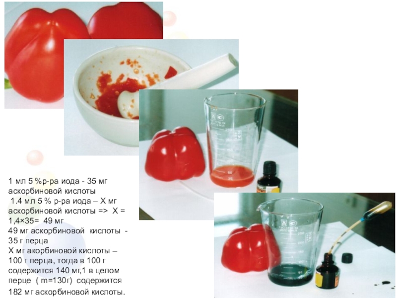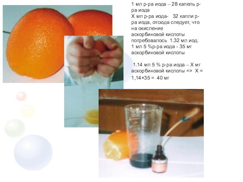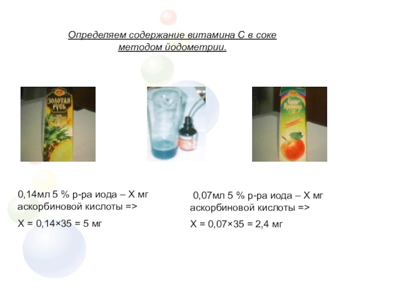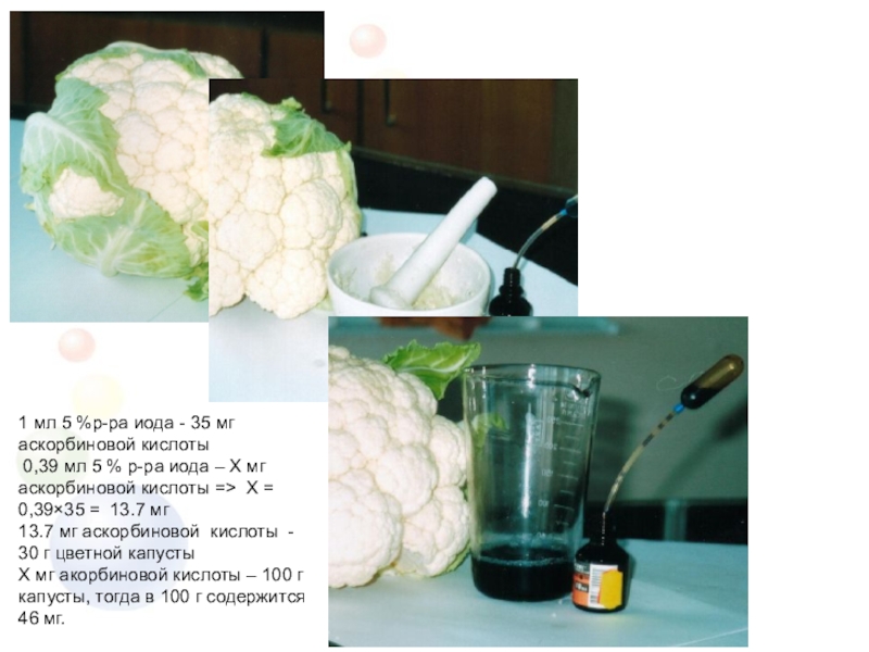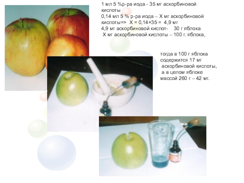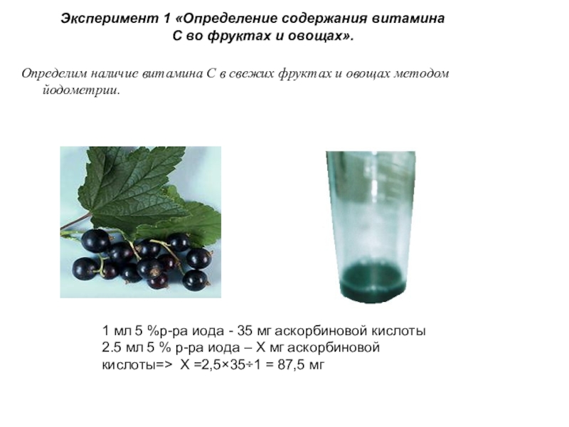 1 мл 5 %р-ра иода - 35 мг аскорбиновой кислоты 2.5 мл 5 % р-ра иода – Х мг аскорбиновой кислоты=> Х =2,5×35÷1 = 87,5 мг