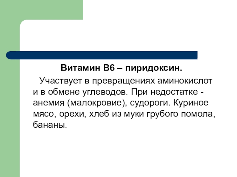 функционирования нервной системы, печени, сердца. Участвует в углеводном обмене. При недостатке – бери-бери. Печень, орехи, яйца, зеленый горошек, отруби.