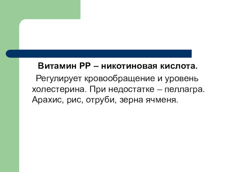 холестерина. При недостатке – пеллагра. Арахис, рис, отруби, зерна ячменя.