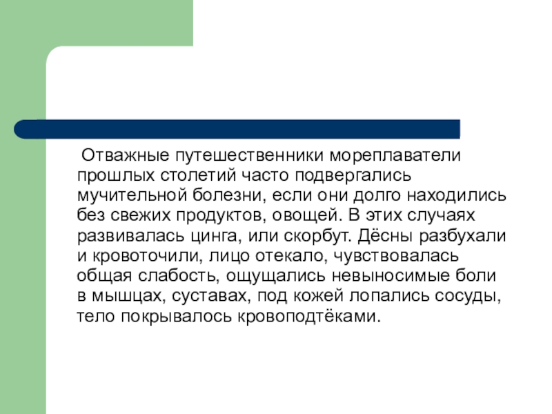 болезни, если они долго находились без свежих продуктов, овощей. В этих случаях развивалась цинга, или скорбут. Дёсны разбухали и кровоточили, лицо отекало, чувствовалась общая слабость, ощущались невыносимые боли в мышцах, суставах, под кожей лопались сосуды, тело покрывалось кровоподтёками.