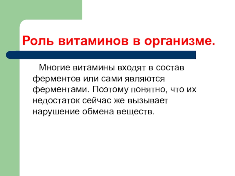 ферментов или сами являются ферментами. Поэтому понятно, что их недостаток сейчас же вызывает нарушение обмена веществ.