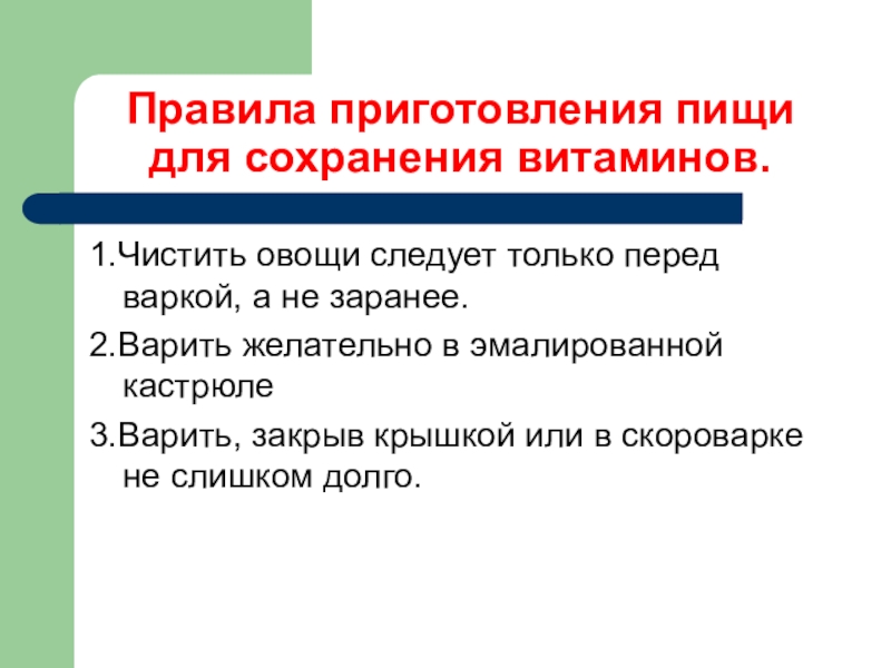 Слайд 18Правила приготовления пищи для сохранения витаминов.