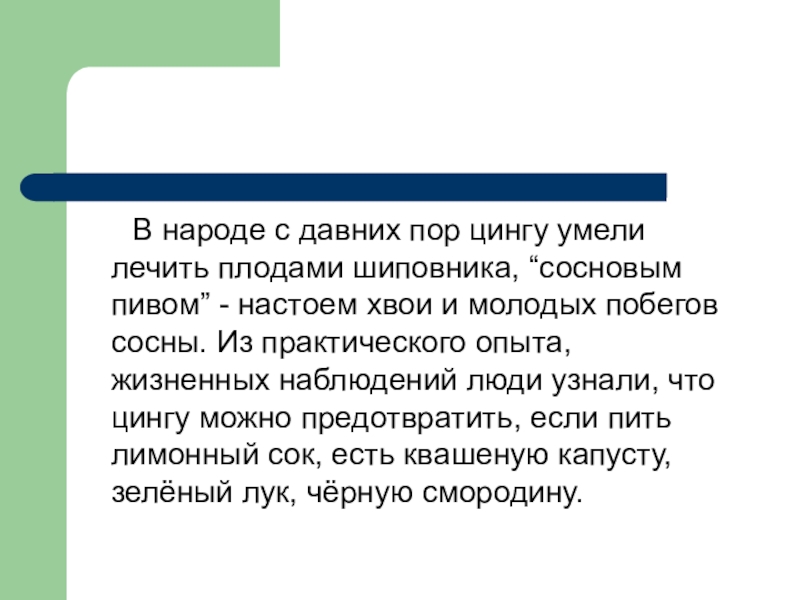 плодами шиповника, “сосновым пивом” - настоем хвои и молодых побегов сосны. Из практического опыта, жизненных наблюдений люди узнали, что цингу можно предотвратить, если пить лимонный сок, есть квашеную капусту, зелёный лук, чёрную смородину.