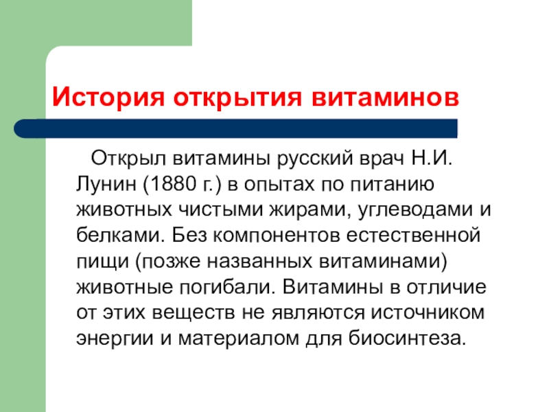 (1880 г.) в опытах по питанию животных чистыми жирами, углеводами и белками. Без компонентов естественной пищи (позже названных витаминами) животные погибали. Витамины в отличие от этих веществ не являются источником энергии и материалом для биосинтеза.