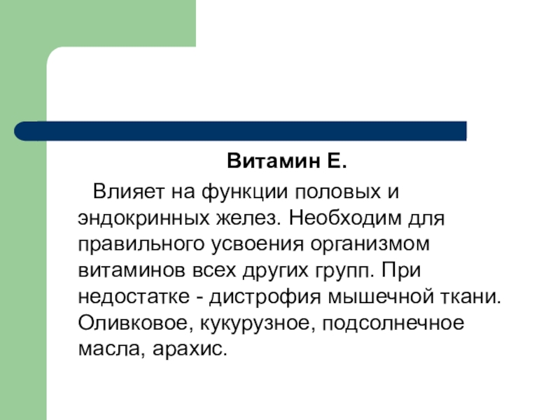 Необходим для правильного усвоения организмом витаминов всех других групп. При недостатке - дистрофия мышечной ткани. Оливковое, кукурузное, подсолнечное масла, арахис.