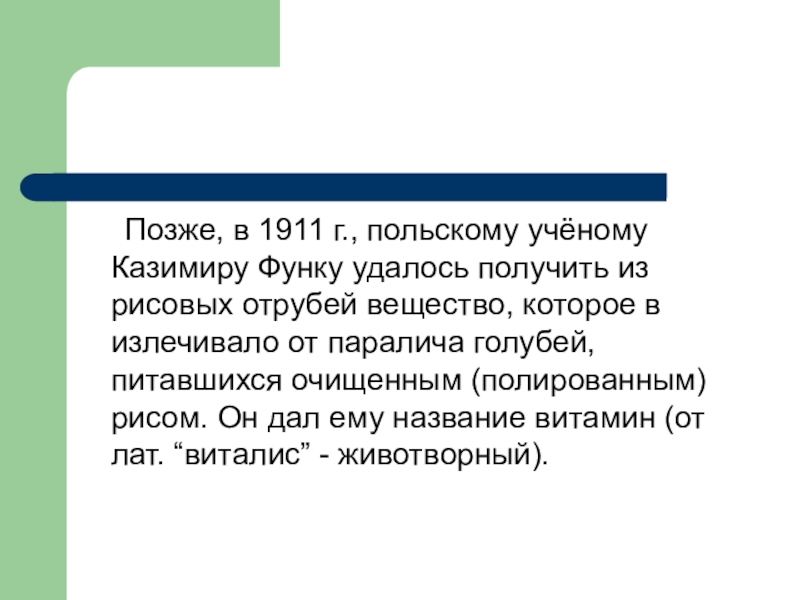 удалось получить из рисовых отрубей вещество, которое в излечивало от паралича голубей, питавшихся очищенным (полированным) рисом. Он дал ему название витамин (от лат. “виталис” - животворный).
