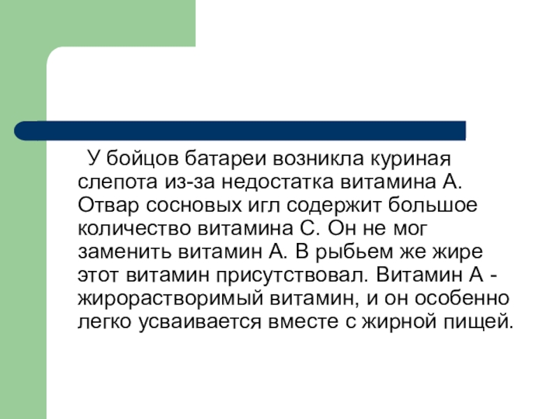витамина А. Отвар сосновых игл содержит большое количество витамина С. Он не мог заменить витамин А. В рыбьем же жире этот витамин присутствовал. Витамин А - жирорастворимый витамин, и он особенно легко усваивается вместе с жирной пищей.