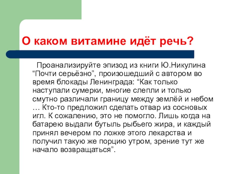 Ю.Никулина “Почти серьёзно”, произошедший с автором во время блокады Ленинграда: “Как только наступали сумерки, многие слепли и только смутно различали границу между землёй и небом … Кто-то предложил сделать отвар из сосновых игл. К сожалению, это не помогло. Лишь когда на батарею выдали бутыль рыбьего жира, и каждый принял вечером по ложке этого лекарства и получил такую же порцию утром, зрение тут же начало возвращаться”.